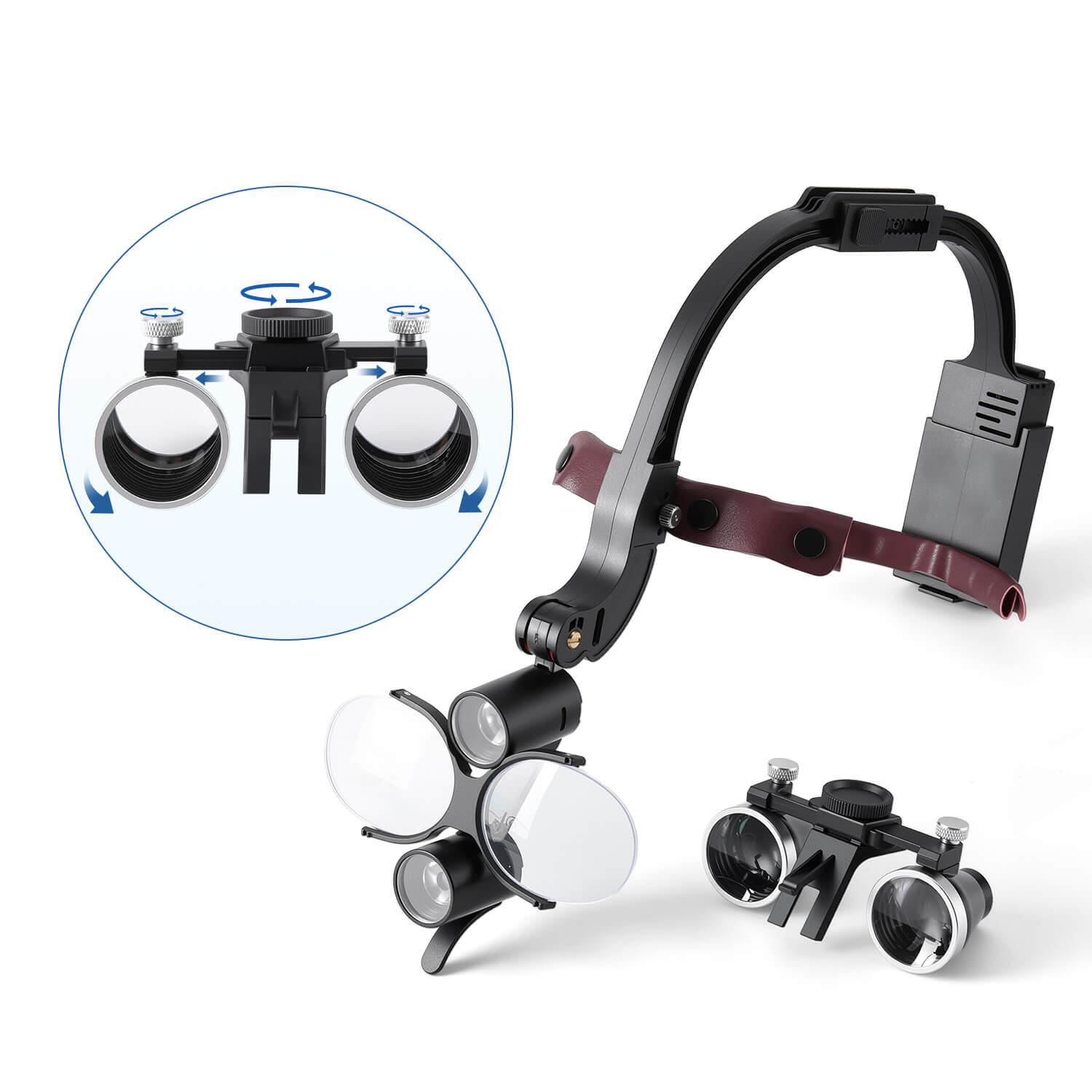 Dental LED Head Light Lamp Magnification Binocular Loupes 2.5X 3.5X. With a magnifying glass. Rechargeable lithium battery. Magnification: 2.5/3.5 X working distance: 320-420mm. 2.5 times magnifier: depth of field 90mm, field of view 100mm/3.5 times magnifier: depth of field 80mm, field of view 60mm.